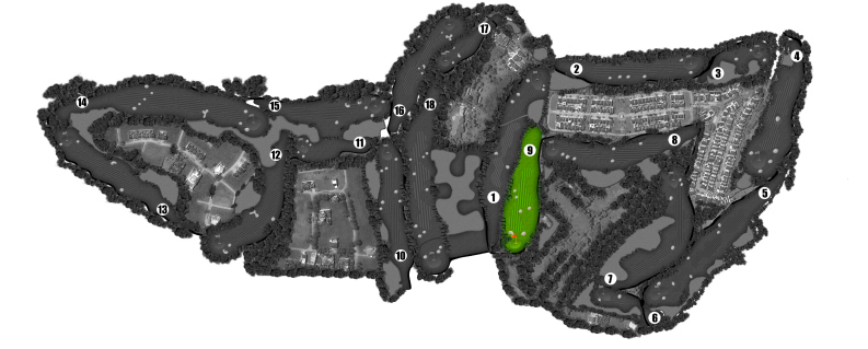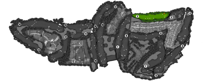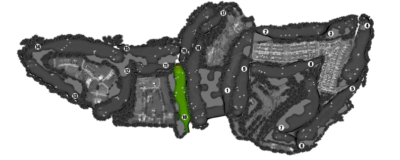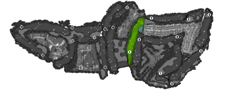 This is a good hole to start off with, an open par 5 with a wide fairway winding through mounds and across a small meandering stream at the second shot; ending in a small tightly bunkered green that sits amongst three connection lakes.